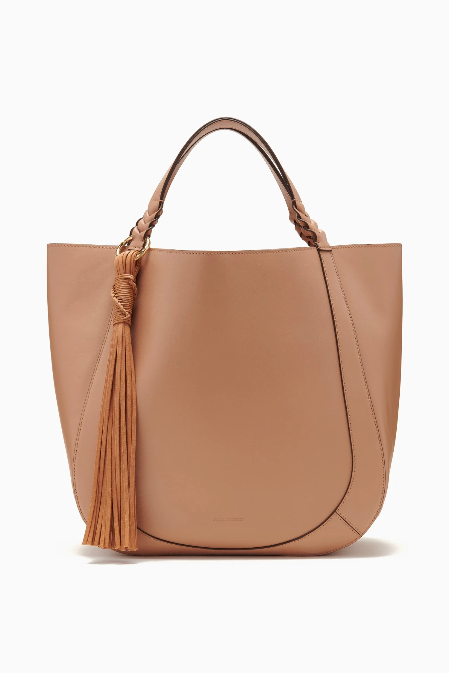 The Albers Tote is a signature Ulla Johnson silhouette, handcrafted in Italy from luxurious leather in a light pink hue. This gorgeous bag has a soft yet structured shape and features braided leather handles, our signature brass loop with a wax cording tassel, and is finished with an interior pocket.