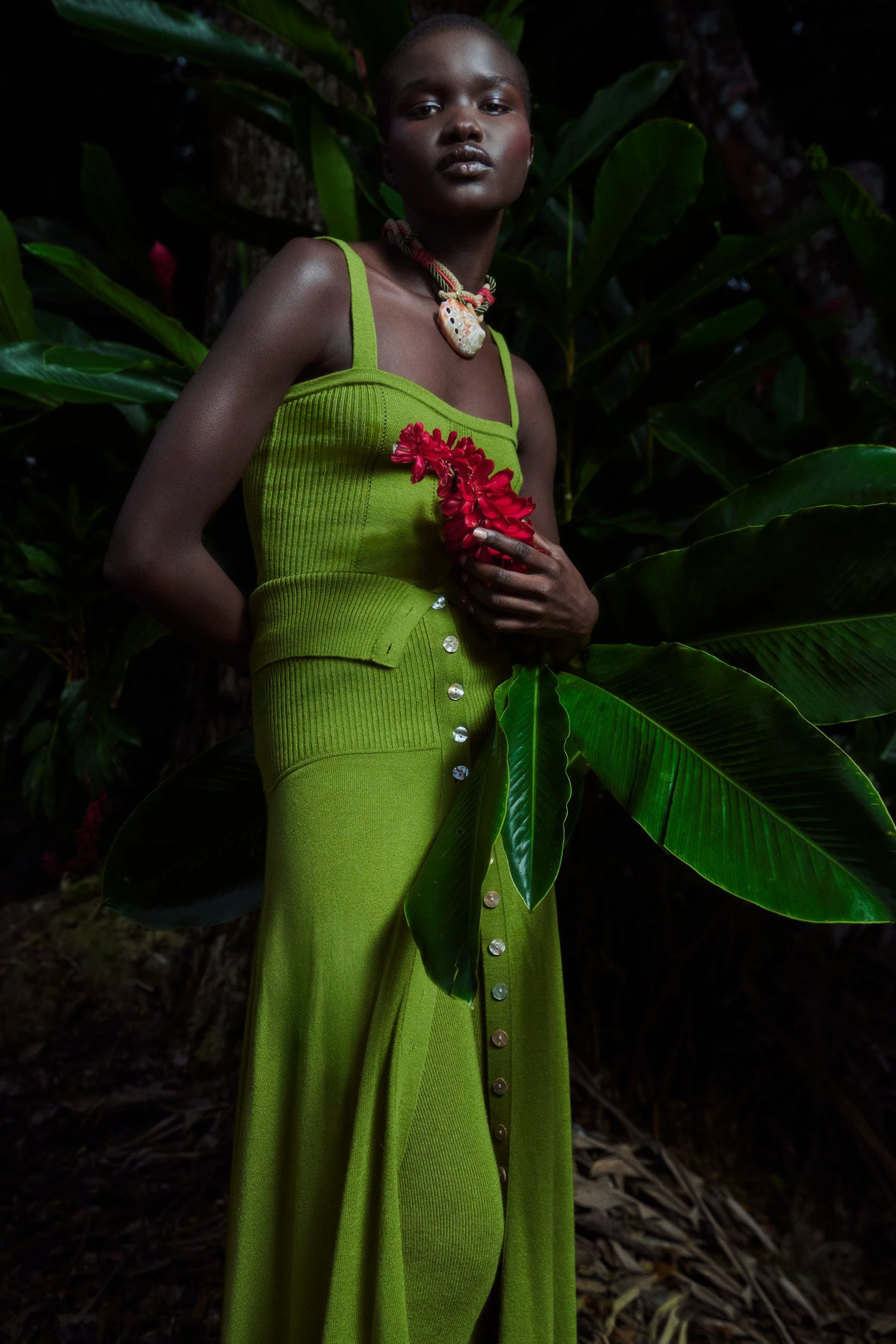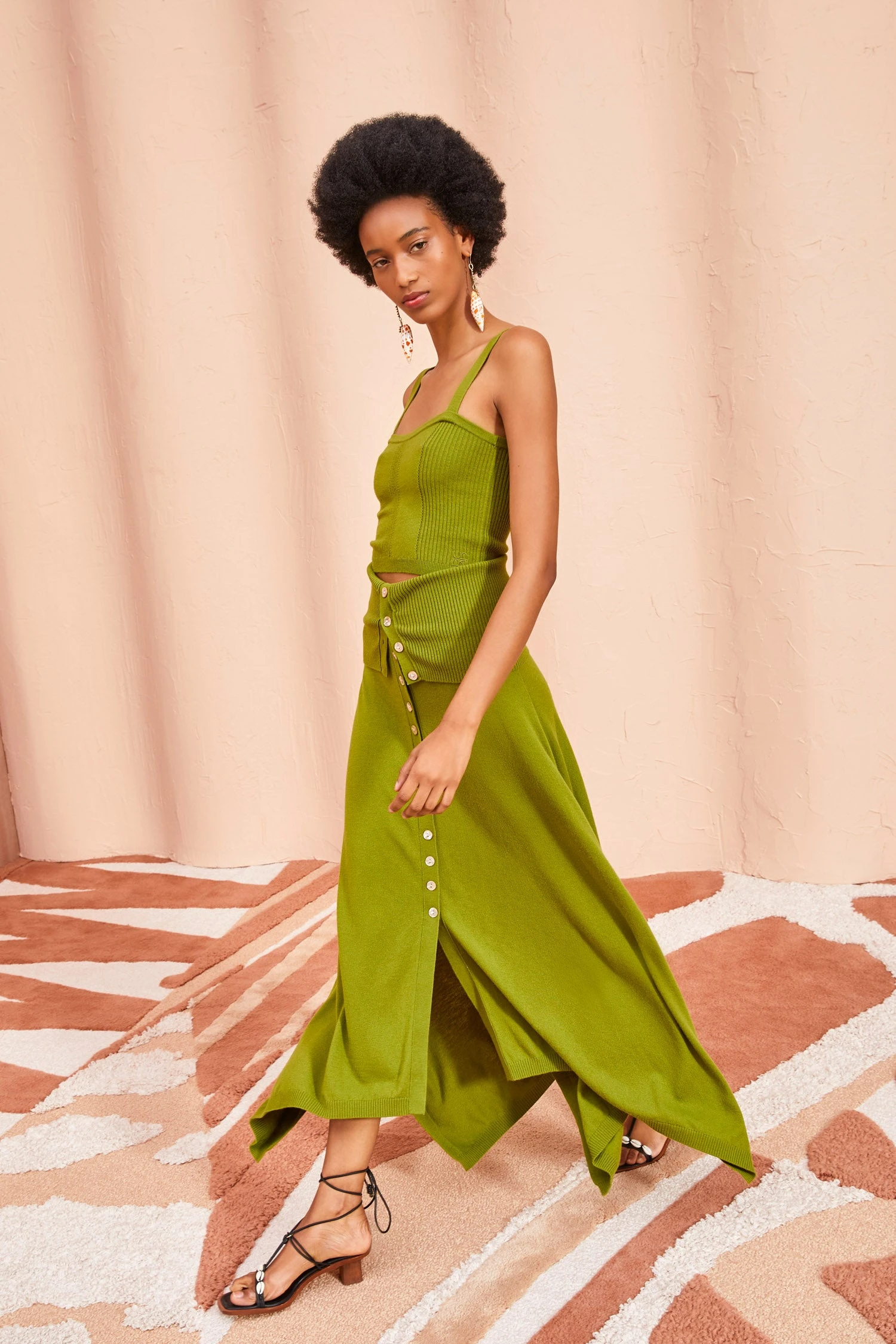 As featured in Look 35 of our Pre-Fall ’23 Lookbook, the Alessi Skirt is knitted in our fine-ribbed luxe merino wool blend. This rich green maxi skirt is a perfect layering piece, featuring an exaggerated ribbed waistband and mother-of-pearl buttons that trail down its front. Finished with a handkerchief hemline.