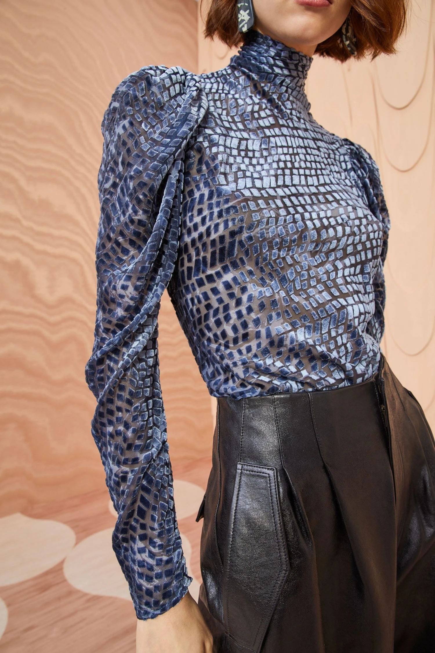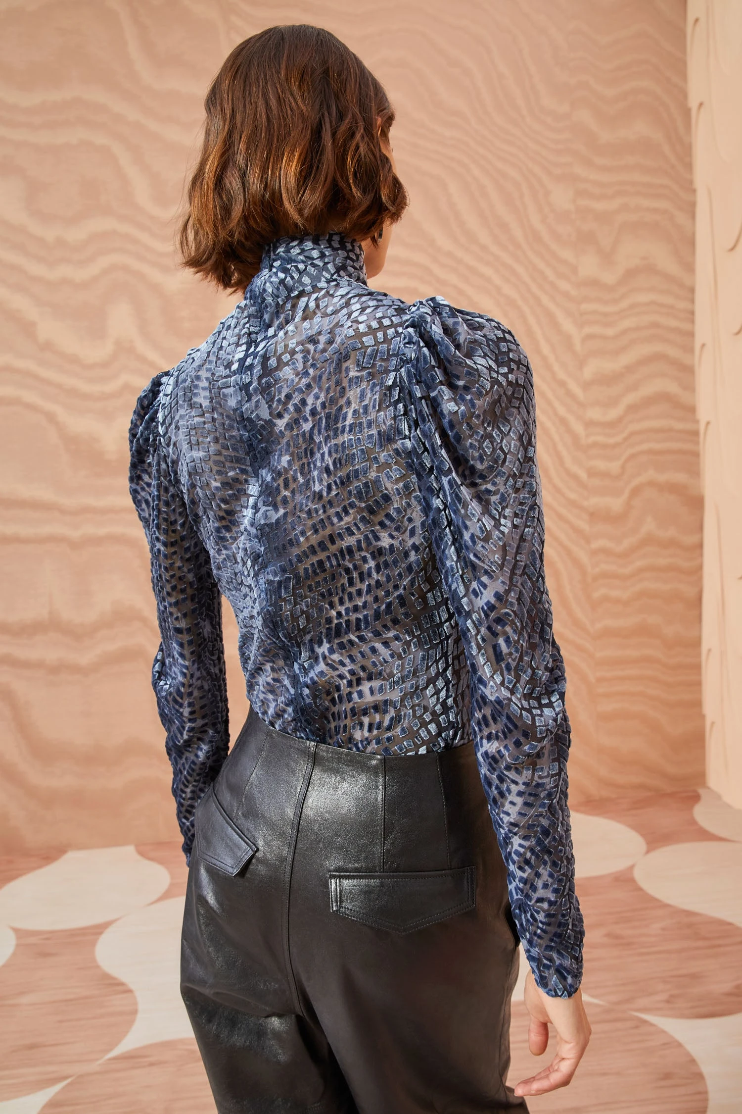 The Althea Turtleneck is crafted from our sumptuous velvet burnout fabrication featuring a swirling moiré motif. Framed by our signature puff sleeves, this marine blue top features an elegant high neck and fastens with a hidden center-back zipper.