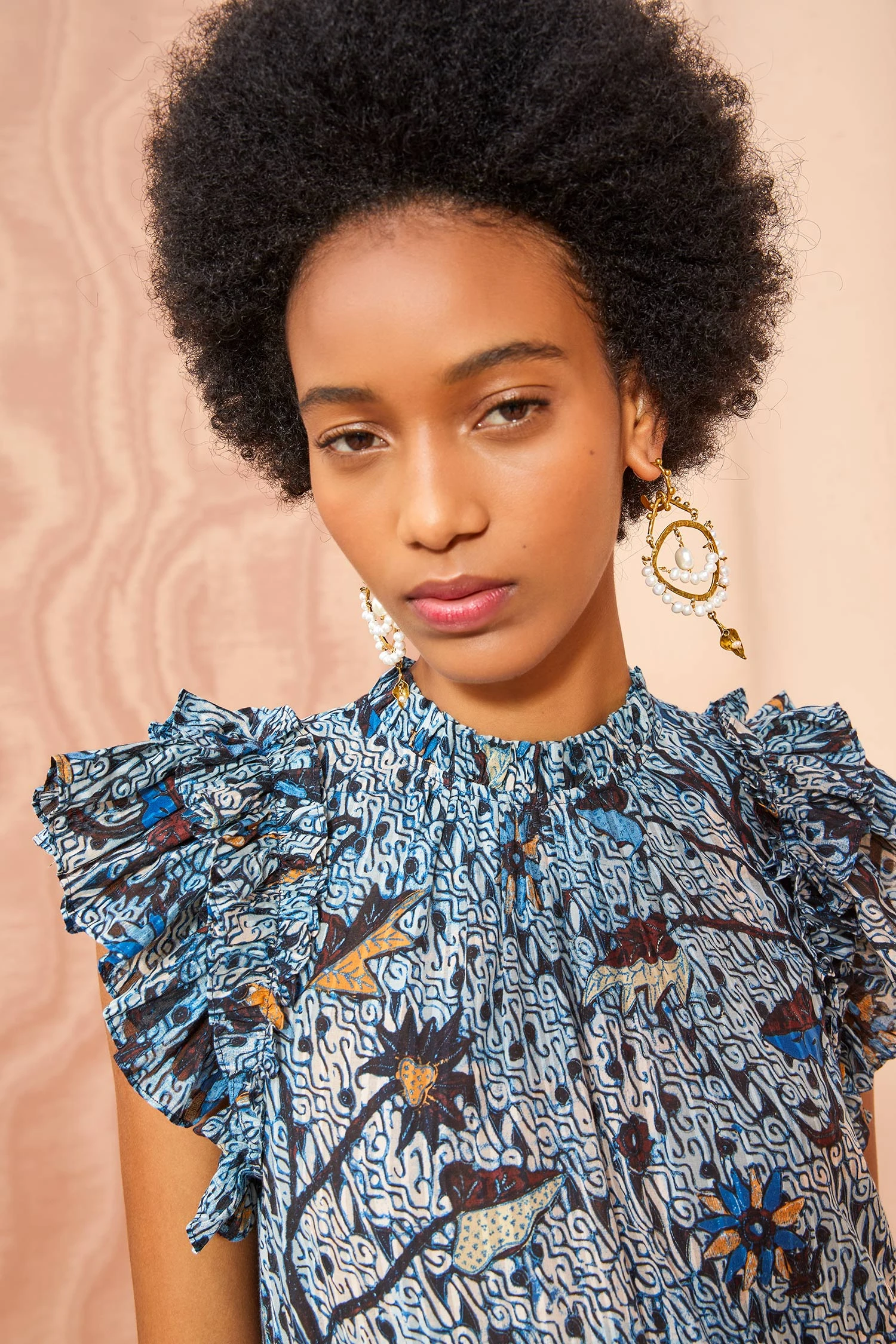 The Denia Dress is a sweet mini dress featuring a high neckine, short flutter sleeves, and a tiered skirt. This relaxed blue and white floral dress is crafted from our signature shadow stripe cotton, in a batik-inspired print.