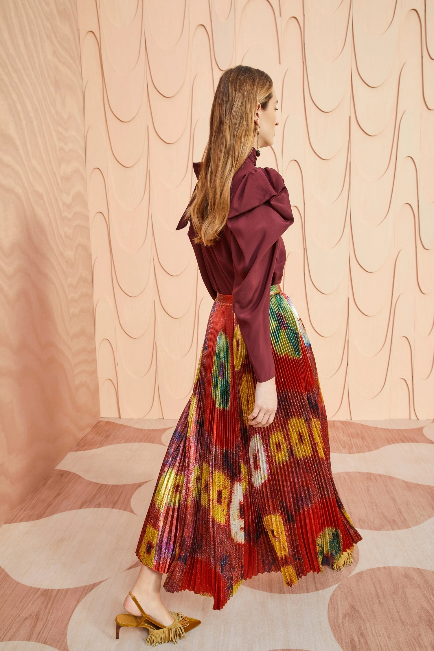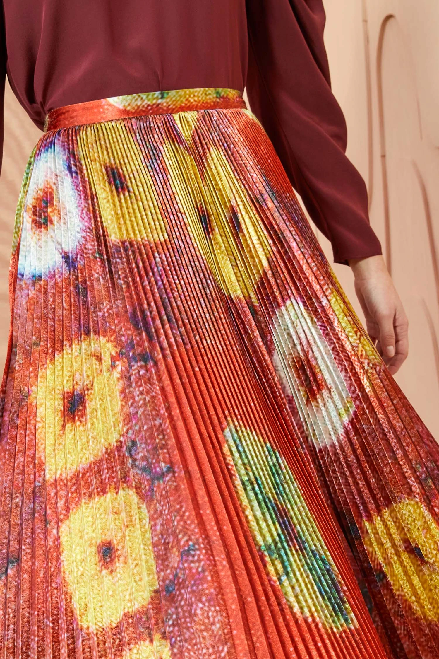 As featured in Look 11 of our Autumn/Winter ’23 Runway Show, the Rami Skirt is made from pleated satin in our standout medallion shibori print, which expands and contracts with movement. This lustrous skirt has a fixed waist and a midi-length hem.